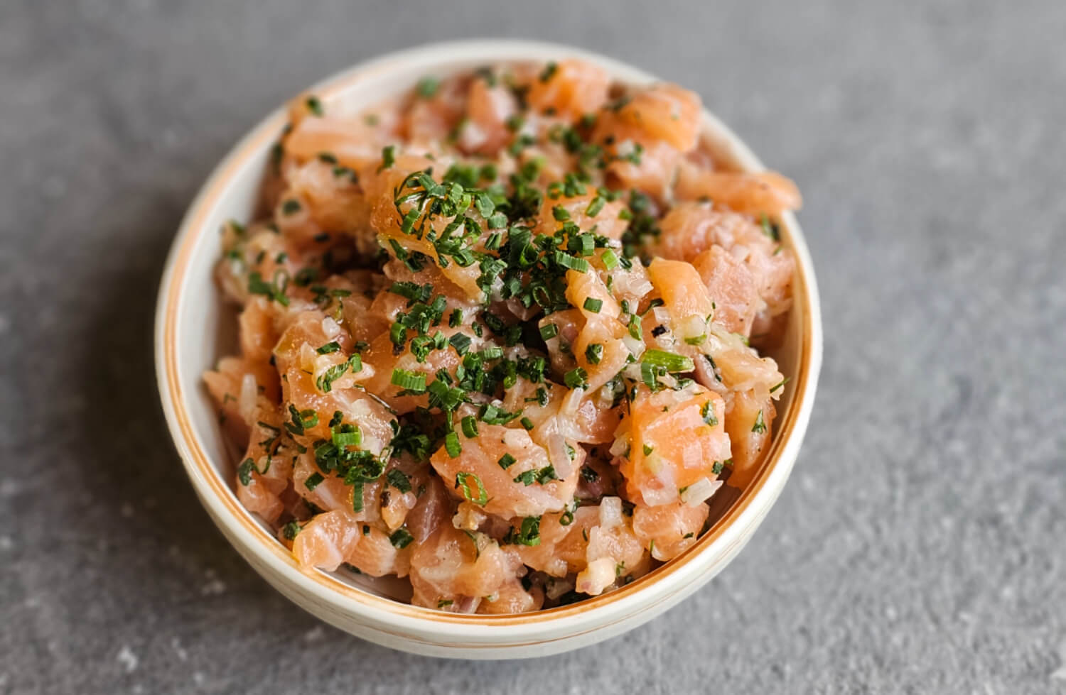Vår laksetartar lages av fersk, håndskåret laks og toppes med ørretrogn. Smakene balanseres med chili, koriander og ingefær for en frisk og elegant tartar som passer perfekt som forrett eller på et skalldyrfat.