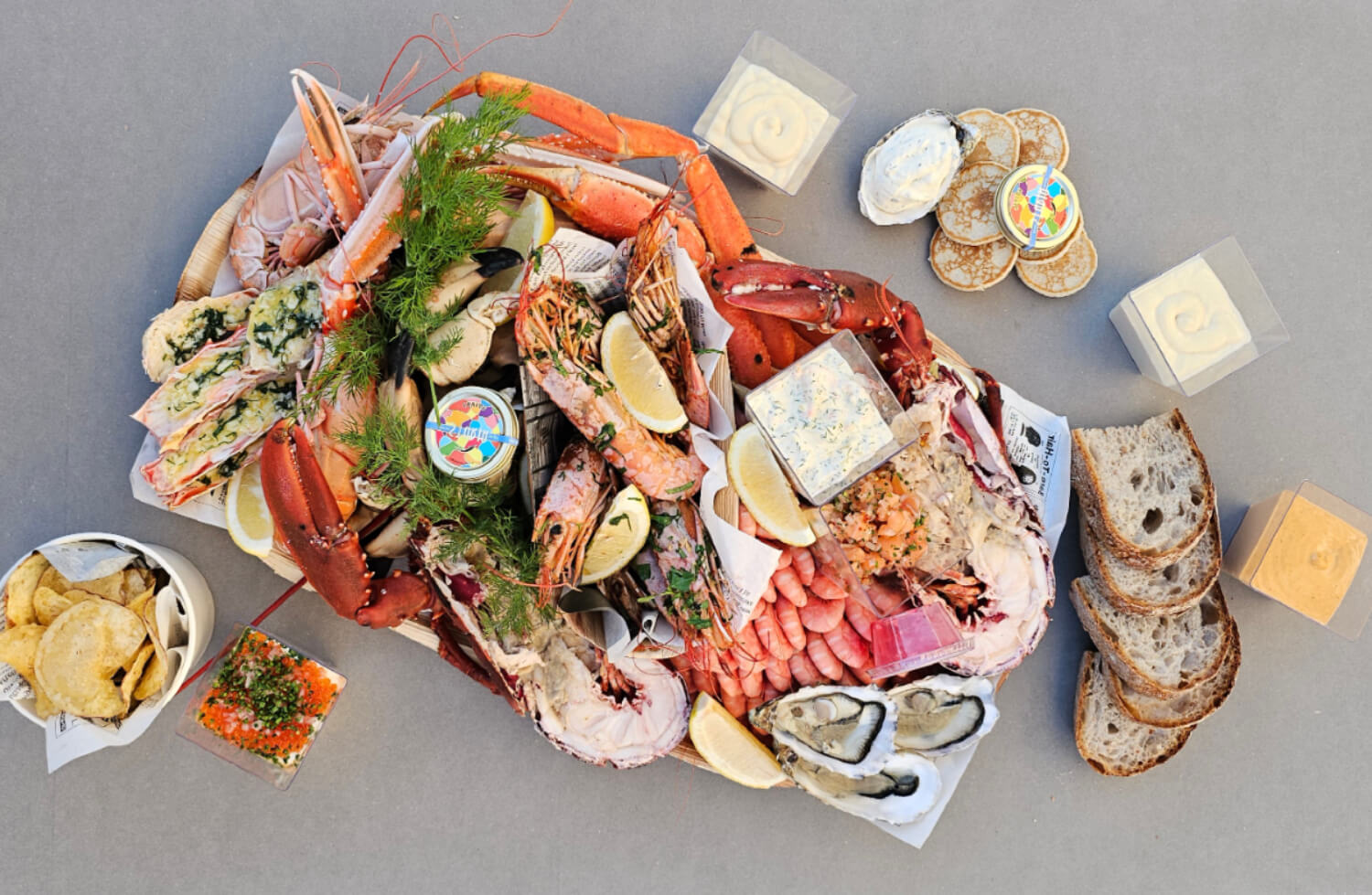 Vårt mest eksklusive skalldyrfat – med norsk hummer, kongekrabbe, østers, Sturia Vintage Baerii-kaviar og delikate tilbehør. En komplett skalldyrsopplevelse for spesielle anledninger.