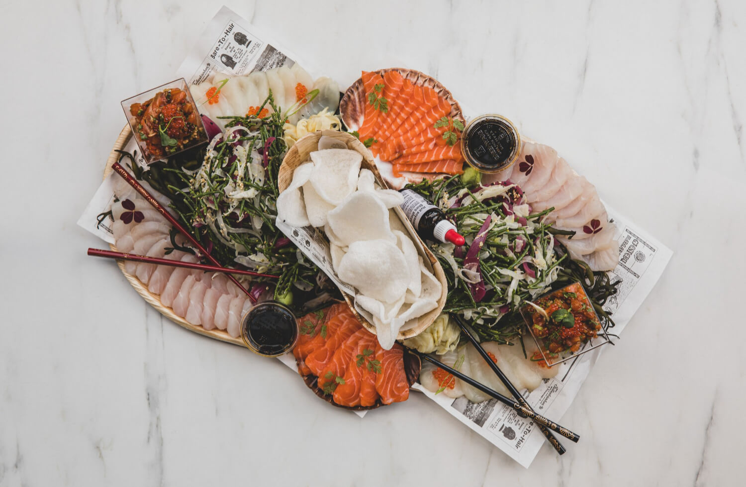 Delikate tynne strimler av fisk og masse godt tilbehør. Består av,