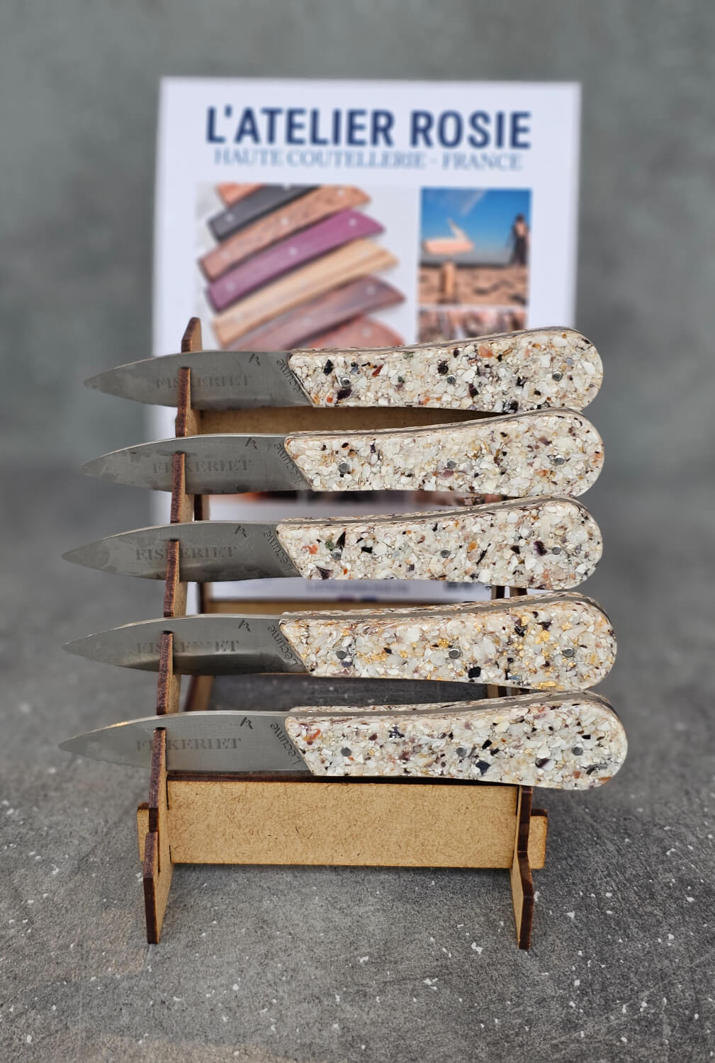 Bladene er laget av rustfritt stål, og håndtakene er tilgjengelige i østersskall og østersskall med forgylling stabilisert i en gjennomsiktig harpiks.